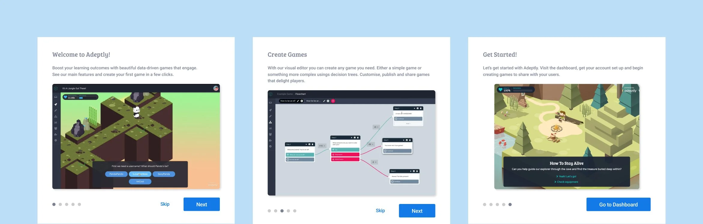 To welcome first time users into Adeptly, it was important for us to highlight the main features of the product and provide some guidance. This way we would be able to show right away the value of the product and set up the user expectations.