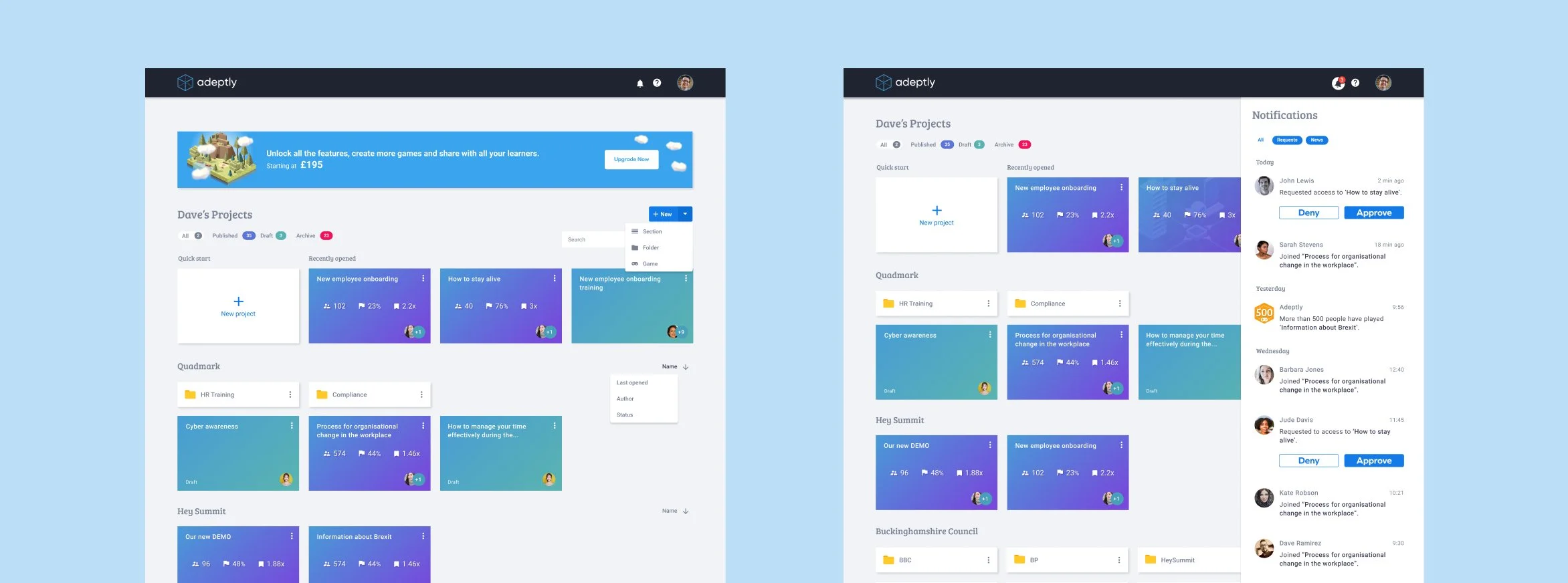 Adeptly is a learning development platform used by business-to-business corporates to train, assess, and change learner behaviour. The company’s product is a game-creation platform that allows its creators to design and build games based on a decision tree model, then distribute that game to learners.